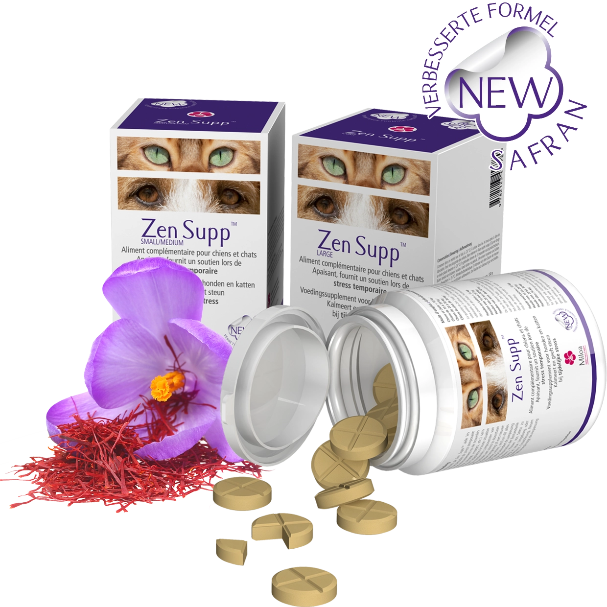 Die Kombination der Bestandteile von Zen Supp™ hilft unseren Haustieren, Phasen von Stress zu überwinden (Alleinbleiben, Gewöhnung an neue Umgebung oder neue Personen, Phasen der Rekonvaleszenz, Entwöhnung, Reisen usw) ohne Schläfrigkeit. Zen Supp™ Miloa begünstigt die Anpassung an veränderte Situationen.
